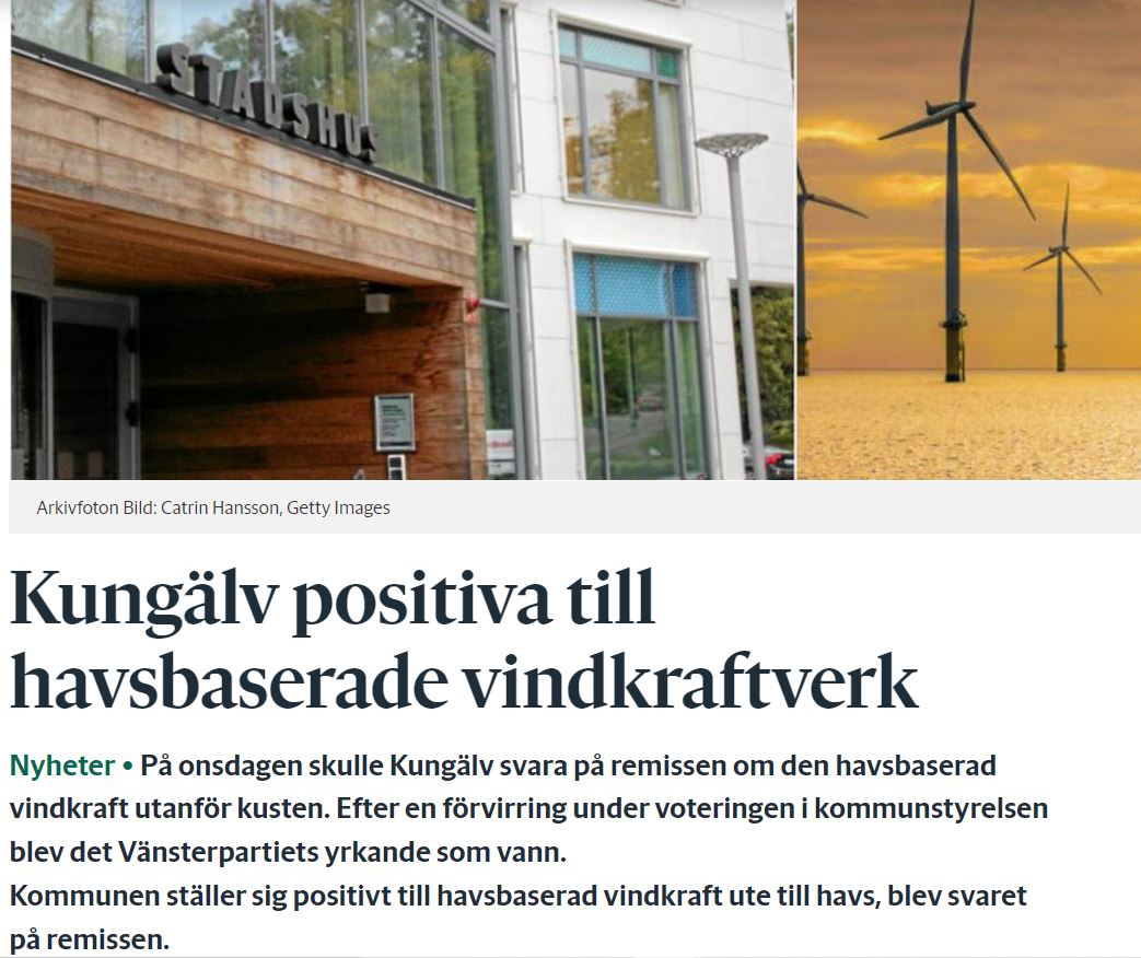 På kommunstyrelsens sammanträde under onsdagen fick Vänsterpartiet i Kungälv igenom en skrivning som visar att Kungälvs kommun ställer sig positiva till en etablering av vindkraft ute till havs i sitt remissvar till den ansökan om en etablering av havsbaserad vindkraft i västerhavet. Vänsterpartiets mål är ett samhälle med 100 procent förnybar energiförsörjning senast år 2040 och då är det viktigt att vi får till en utbyggnad av bland annat havsbaserad vindkraft så snart som möjligt.